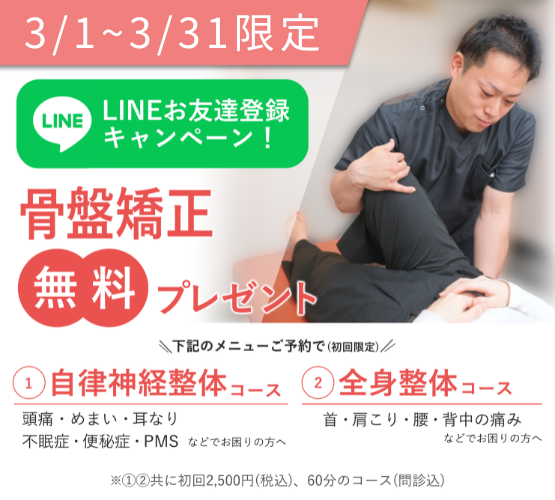 下記当院(初回)メニューをご利用で、骨盤矯正を無料プレゼント!
